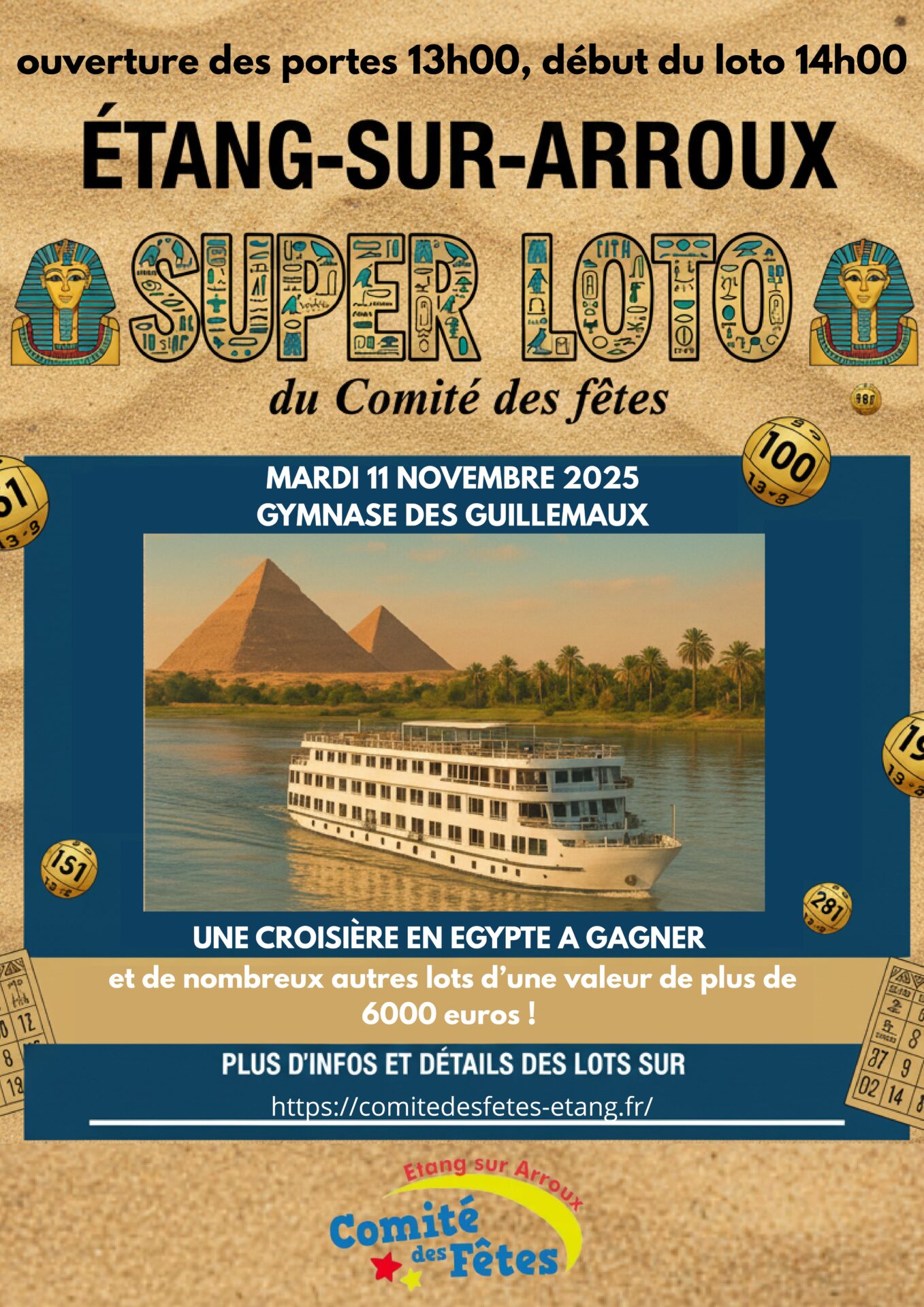 Le comité des fêtes d’Etang sur Arroux vous propose une nouvelle édition de son Super Loto le mardi 11 novembre 2025 au Gymnase des Guillemaux.